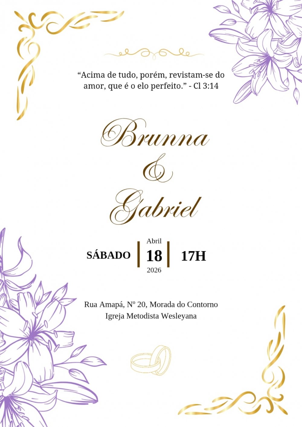 Gostaríamos muito de contar com a presença de todos vocês no momento em que nossa união será abençoada diante de Deus! A cerimônia será rápida e tentaremos ser extremamente pontuais. Contamos com vocês! Dia 18 de Abril de 2026, às 17h.